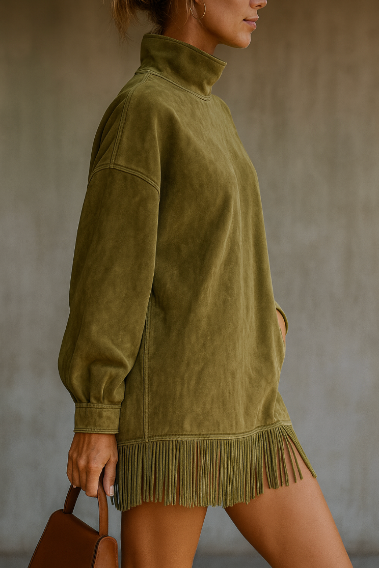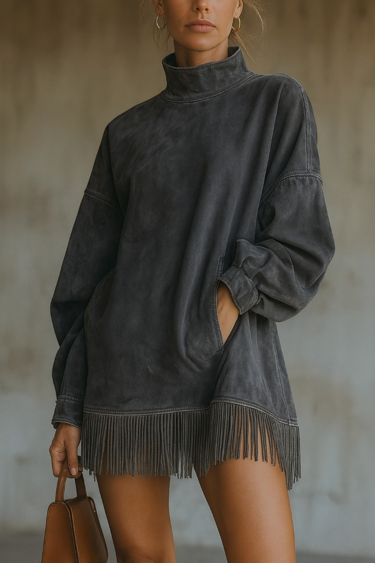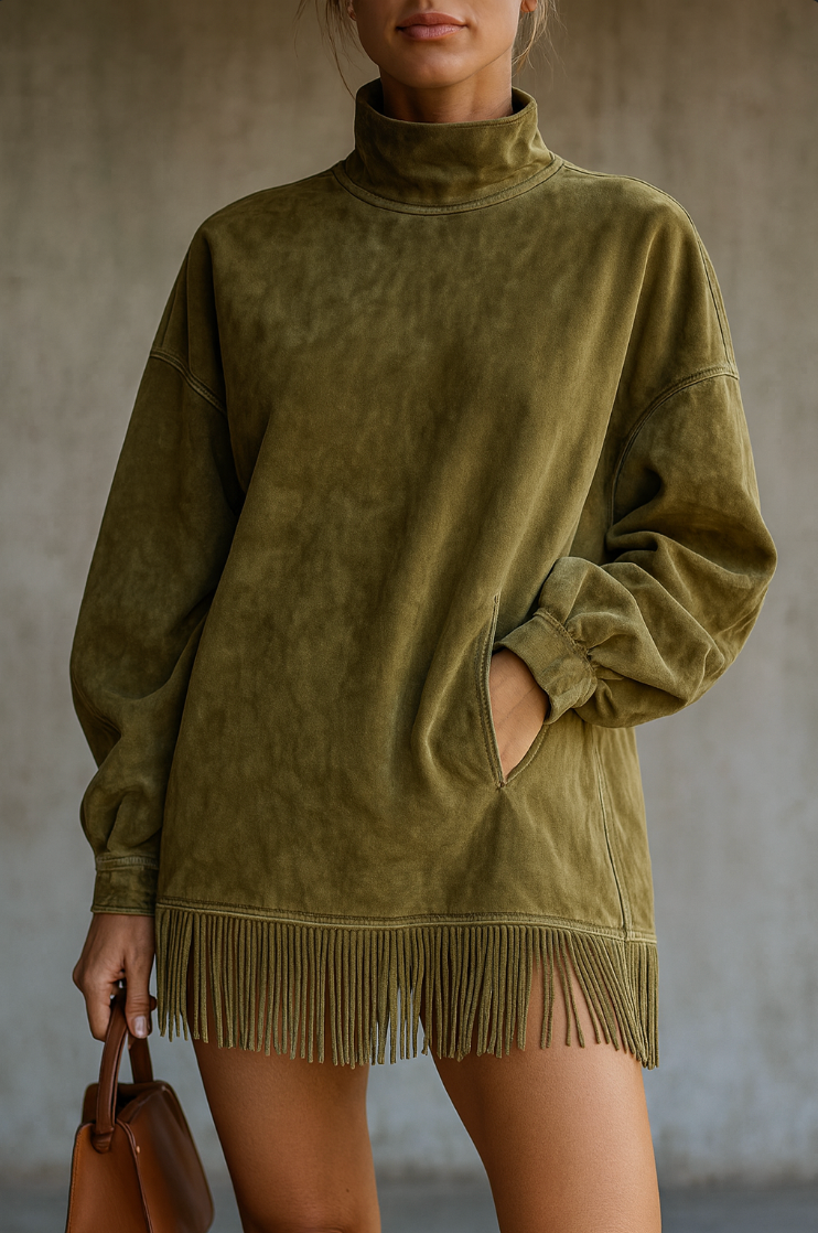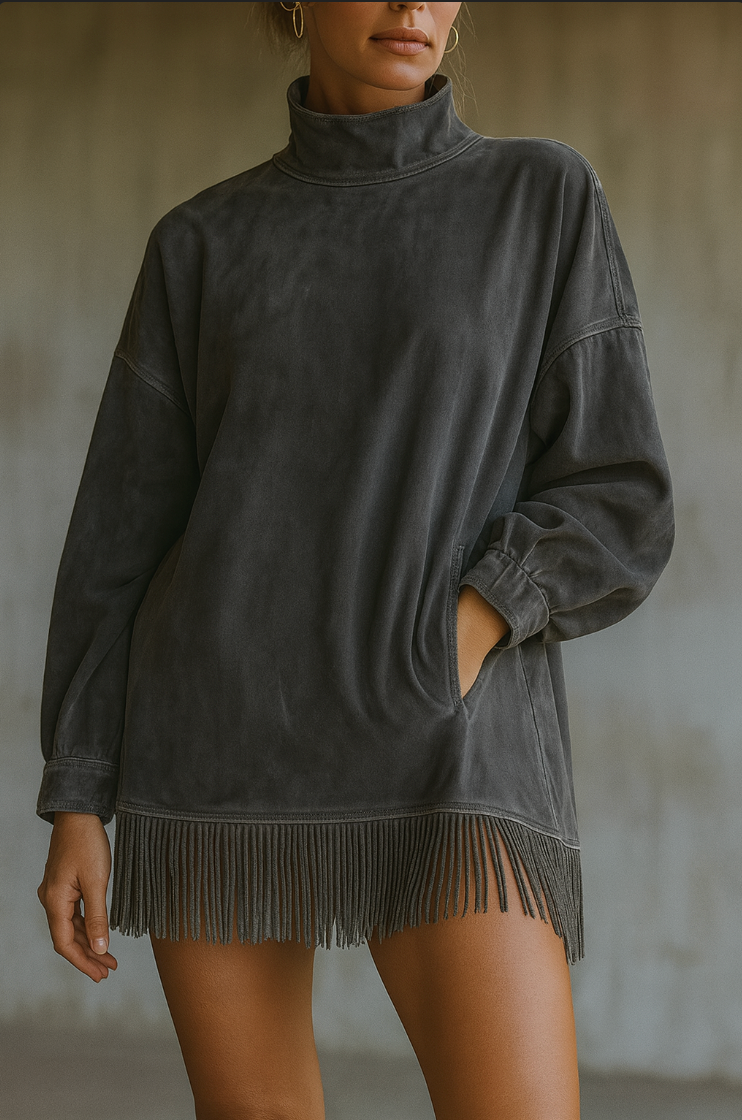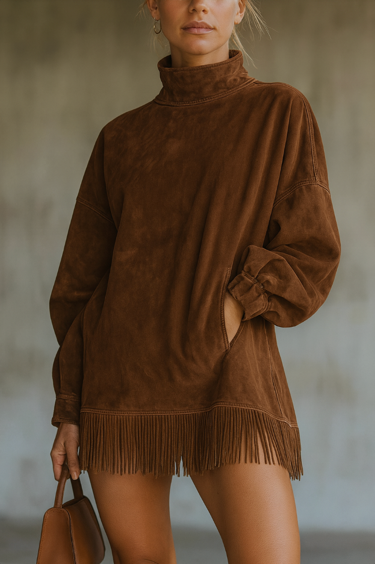 Sa matière ultra-douce, son col montant élégant et ses franges délicates créent un ensemble harmonieux qui respire le style et la confiance.